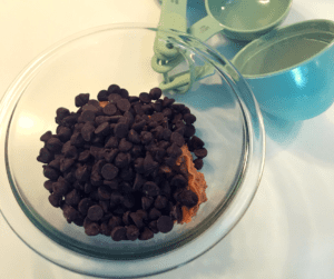 - Place the peanut butter (nut butter) in the bottom of the bowl and pour chocolate chips on top – this will prevent the chocolate from burning. Microwave in 30-second increments, stirring until melted. (Double boiler can be used in place of microwave).