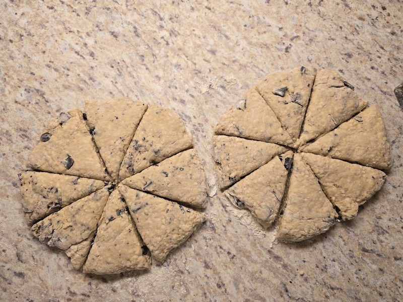 10. Cut each round into 8 triangles and place on baking sheets.