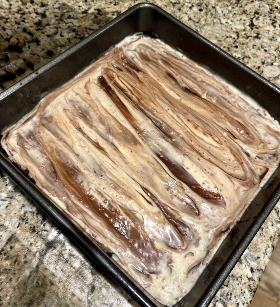 - Once the brownies are done, take them out and carefully spread the melted peppermint squares across the top.