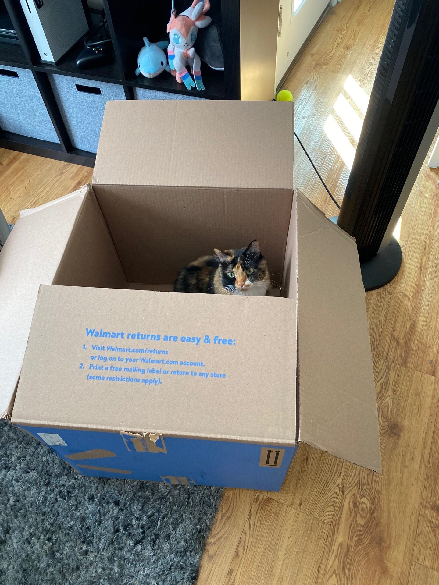 Tortoise-calico cat in a big empty box, ready to be packed.