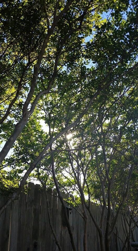 Crepe myrtles now taller than the fence, taller than the roof behind us.