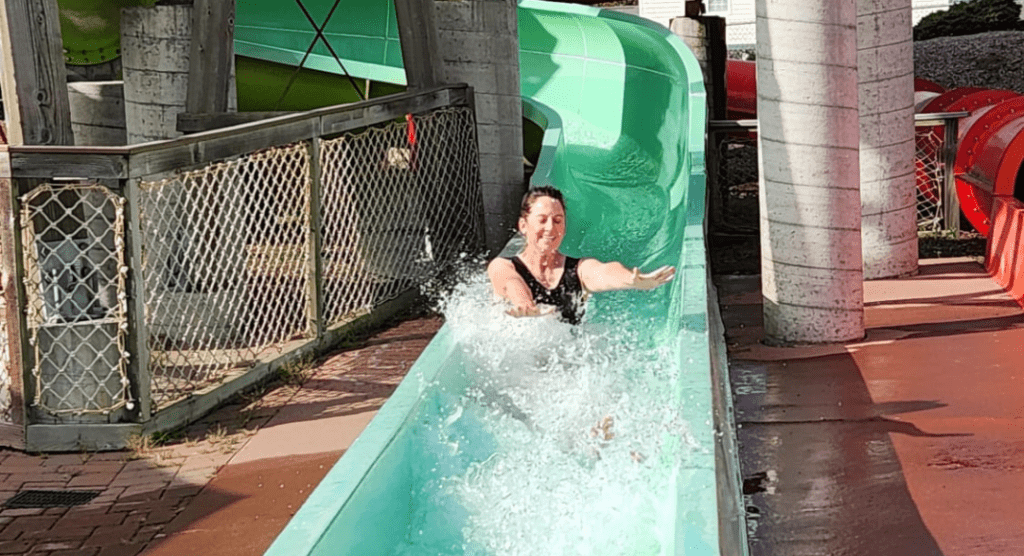 After getting our fill of the rides, we headed to the car to change into our swimsuits and have lunch. I couldn’t believe my kids had made it 4 hours without eating a single thing! Four snack attack and “I’m starving” whine-free hours! It was a miracle! We all took turns changing in the back of the car while we reminisced about our favorite rides and how much fun we were having. When it was my turn to change, both of my kids said, “Mom, you’re putting your swimsuit on?” They know me well and expected me to guard the bags while their teeth chattered and they shivered their way through the splash pads and slides. The outside temperature was about 78 degrees, but this made the water clock somewhere between 65-68 degrees. “Of course,” I said, “You know I always wear my swimsuit even if I don’t get in.”